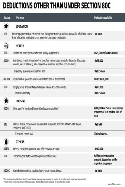 If you have exhausted the limit under section 80C through contributions to EPF, tuition fee and life insurance premiums, look for other deductions available to you. For instance, section 80D provides deduction against health insurance premium. Health insurance is a must-have product, and the premium qualifies for a deduction of up to Rs25,000. This limit includes the deduction of Rs5,000 allowed for preventive check-ups. For senior citizens, the limit is higher, at Rs30,000.